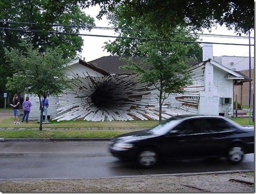 2005年にテキサスを襲った竜巻による被害を彷彿とさせる、巨大な穴の開いた家。ちょっとした錯視の世界なんだけど、世界中から注目され、これを作ったアーティスト・建築家のダンハ・ヴェルとディーン・ラックに依頼が殺到しているんだそうだ。
