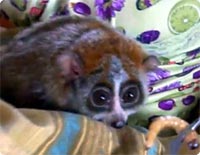 スローロリスの「ロリス」はオランダ語で道化役者の意味で、まるごと訳すと「のろまのピエロ」、日本では昔「ケッカイ」と呼ばれていたそうだ。
