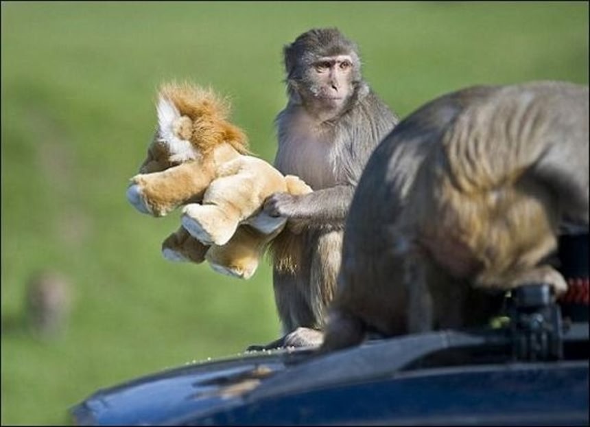 猿の惑星から来た方たちなのかどうかはわからないままに、1台の車が猿の軍団によって占拠された模様。猿たちは車を興味深く見学し、使えそうなものは、根こそぎ奪い取っていったという。