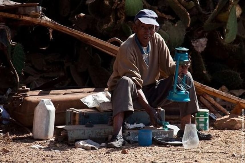 スクラップ状態の兵器の下、未だ紛争が続き、住む家を失った人が、廃品を利用して暮らしているという。