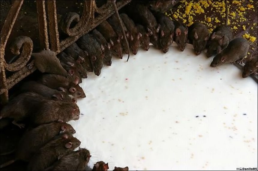この画像を大きなサイズで見る寺では、日に何度も食事の時間があって、大きな盆一杯のミルクが注がれネズミたちに与えられる。盆のふちに秩序正しく並びながらミルクを飲むネズミたち。