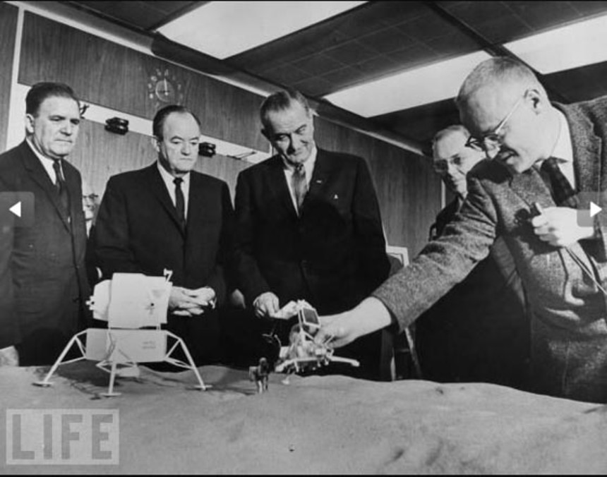 この画像を大きなサイズで見る1965年、NASAの研究員と副大統領らが集まり月面に着陸モデルをチェック