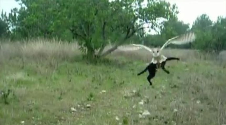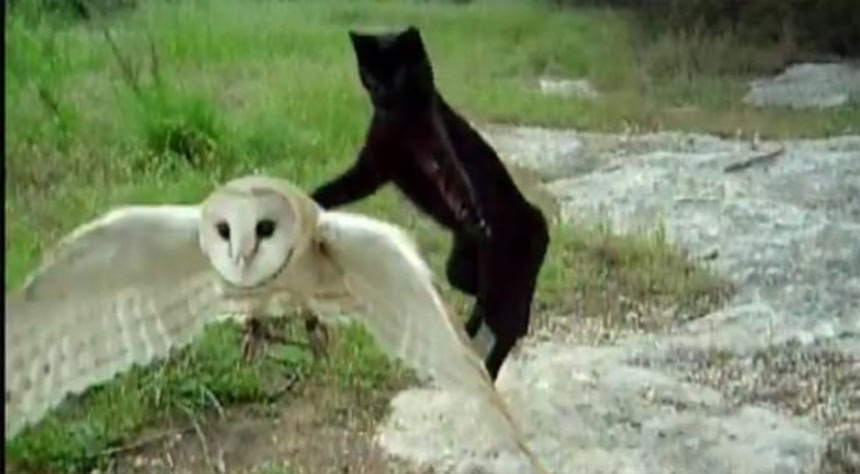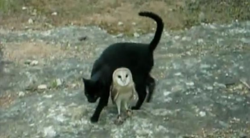 ネコがフクロウを馬飛びみたいに飛び越えるトコ、キュン(´艸`)
