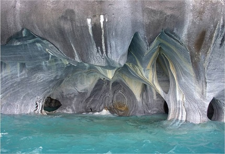 南米チリとアルゼンチンの間にあるヘネラル・カレーラ湖(ブエノスアイレス湖)は、氷河に削り取られて出来たといわれる湖で、そこには海の青が反射したエメラルド、ターコイズ、アクアマリン、紺碧のきらびやかな組み合わせがとても美しいマーブル模様の大理石でできた洞窟がある。マーブル・カテドラルと呼ばれるこの洞窟は、湖水の浸食によって出来たものなのだそうだ。