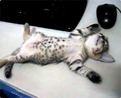 この画像を大きなサイズで見る住所未明某日、あるお宅のパソコンの前に微動だにせず横たわっていたのは、トラ模様の子猫。現場検証を進めているうちに、次から次えと萌え死にが連鎖して起こっていると言う。まさに不可解な死体現場映像なんだ。