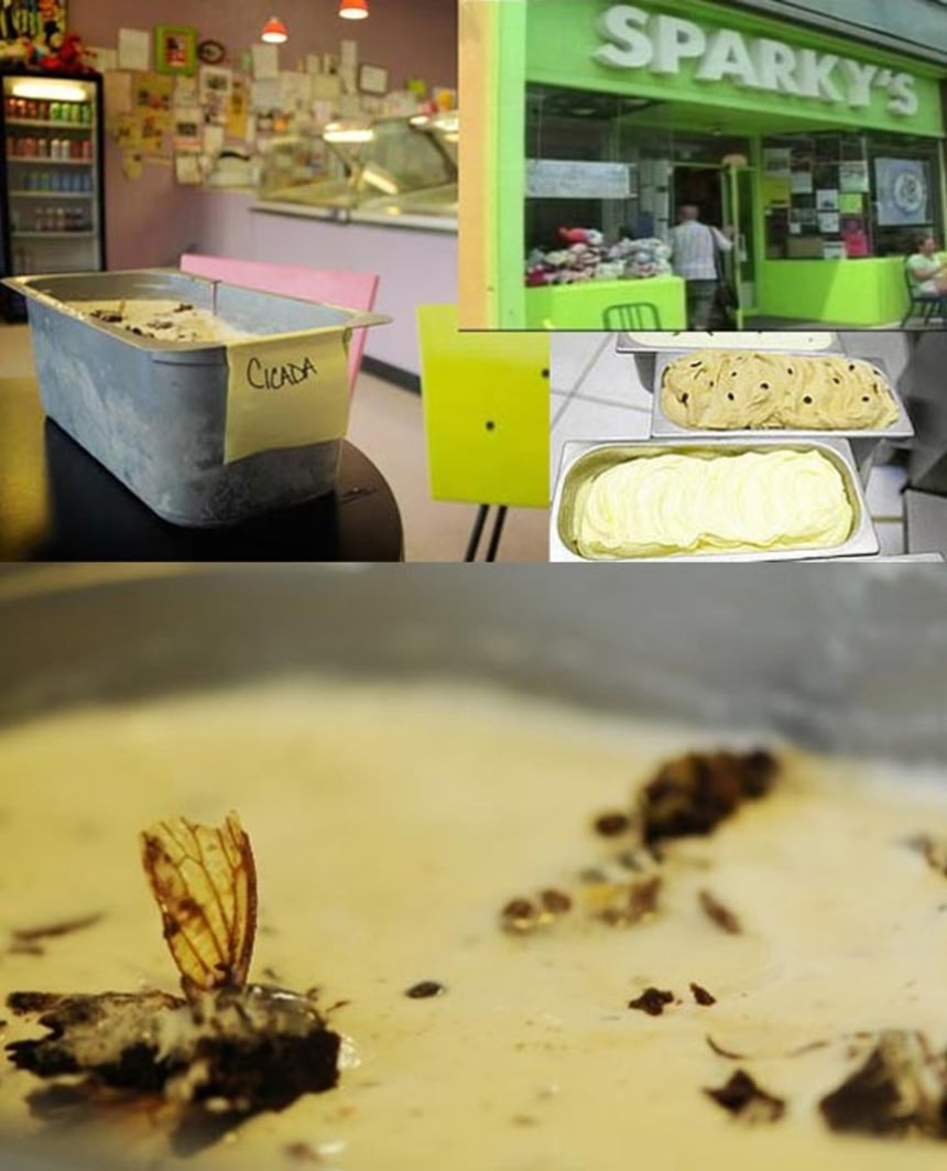 販売しているのはスパーキーズ・ホームメイド・アイスクリーム(Sparky’s Homemade Ice Crea)というお店だそうで、セミアイスクリームの原料であるセミが従業員が裏庭から調達。羽を取り、じっくり煮込んだものに黒砂糖、ミルクチョコレートでコーティング。これをアイスクリームに混ぜ合わせれば出来上がり。