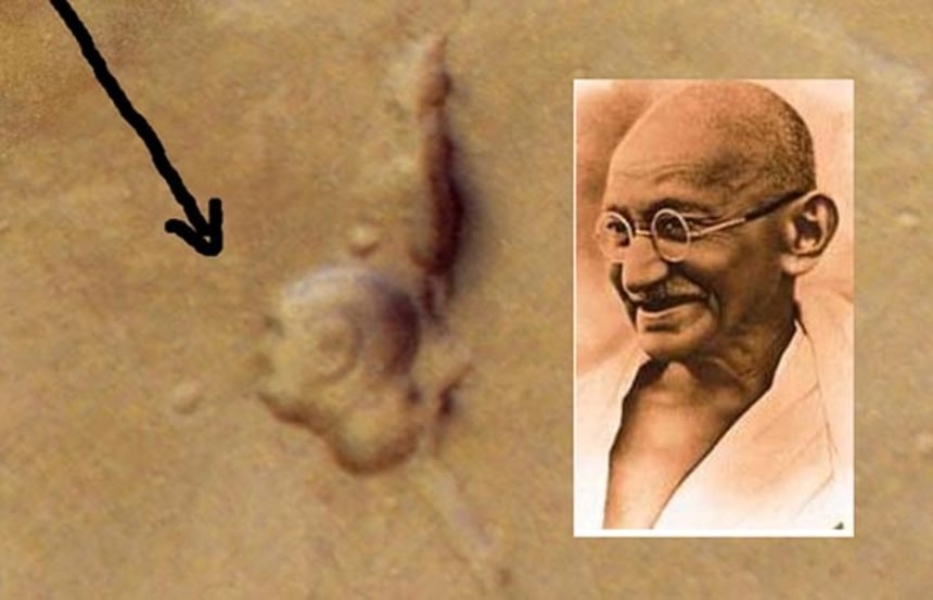 グーグルマーズで火星を探索していたイタリアの天文愛好家、マテオ・ラネオ氏(46)が、ガンジーの顔そっくりの地形を発見したという。