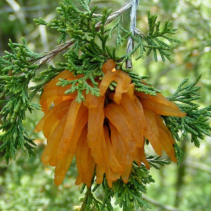 さび菌は、毎年夏に飛散し、ビャクシン類の植物に付着する。年内に発芽することはまれで、翌春発芽・侵入する。そして2年目の春、まるで小さいニンジンのような太い触手状の突起(冬胞子層)を茎や小枝の上につくり、その木を侵食しはじめるんだ。