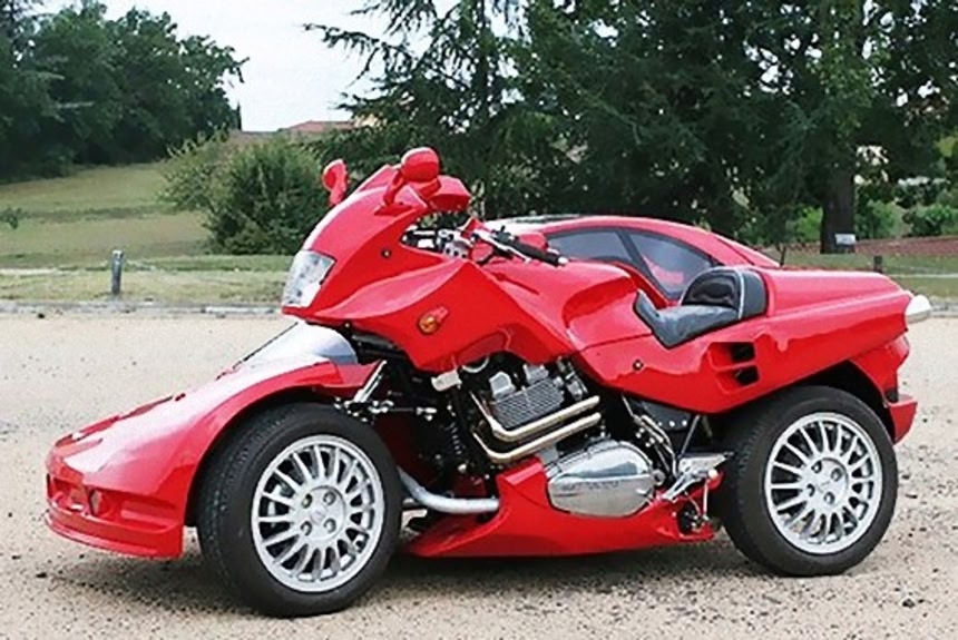 オートバイにサイドカーがついているやつは、キカイダーでおなじみだが、この車というかバイクというか、クルバイク?は、がっつりボディーにバイクと車が一体化させてしまったという神改造。これは日本の道路交通法的に公道を走れるのかどうかはわからないが、走っていたら2度見必至なんだ。