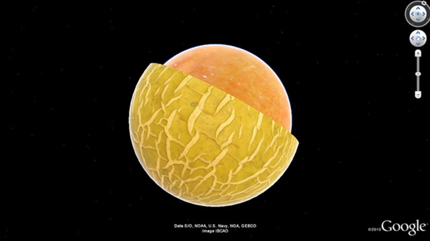 グーグルアースで地球一周の旅にでるのはお手軽簡単なのに未知なる発見が楽しめるので、世界中で大人気なのだけれど、そんなグーグルアースを眺めていたら、地球がジューシーなフルーツに見えてきたアーティストによる映像作品がこれ。なんとおいしそうな地球だこと。
