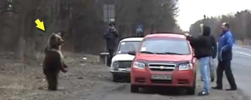 ロシアの森のクマさんが「やあやあ」と2足立ちてドライバーたちにご挨拶