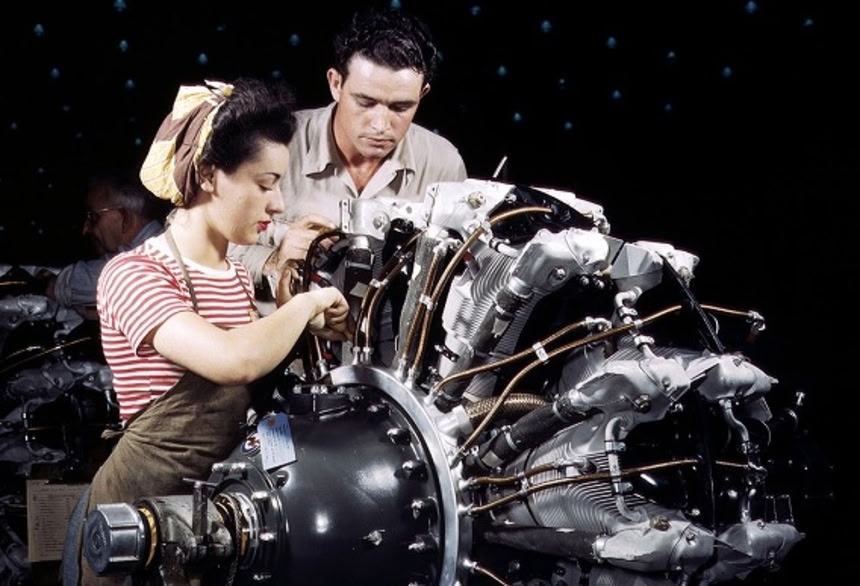この画像を大きなサイズで見るB – 25爆撃機用モーターの組み立てをする美女 1942年