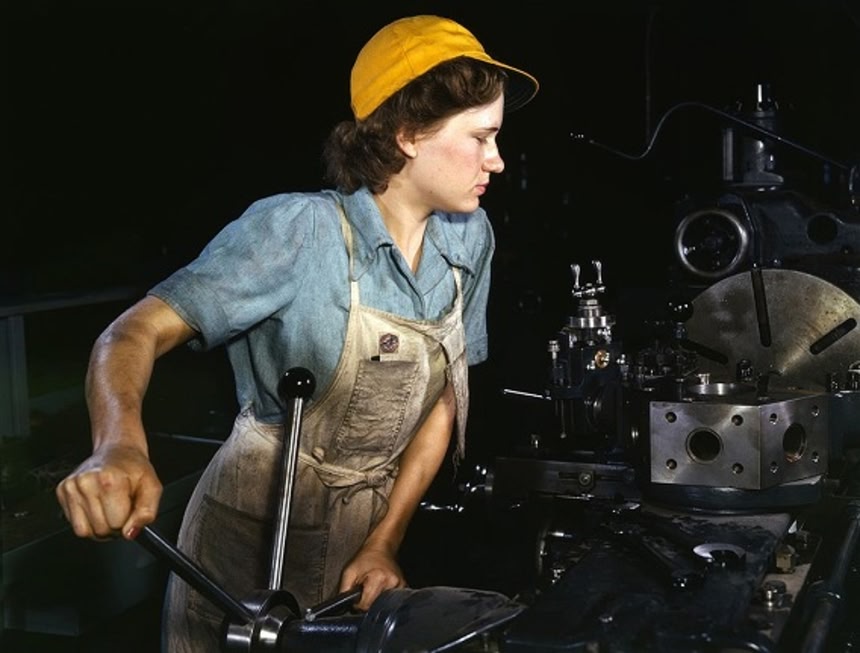 この画像を大きなサイズで見るフォートワースでの輸送機旋盤加工をする女性オペレーター