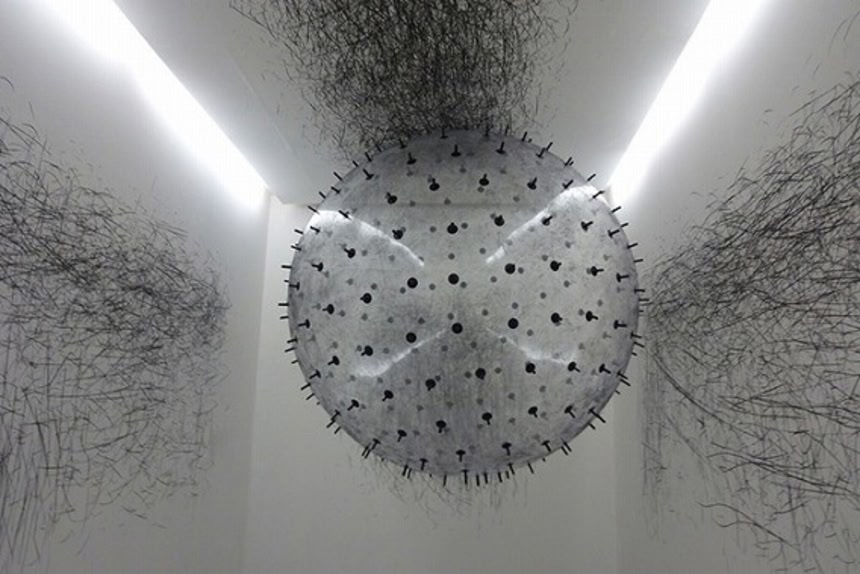 まるで男性がヒゲを剃って1日が経過した毛のような黒い炭片を、巨大なヘリウム風船に無数に取り付け、それを小さな白い部屋に浮かばせ、壁に模様を描くという、奇妙なんだけど斬新な発想のインスタレーション。壁に炭片描かれた絵も、なんていうかこれまた無駄毛っぽく見えてしまうので、ニュルマニアのパルモとしては個人的にはそのキッチュ感が好きだな。