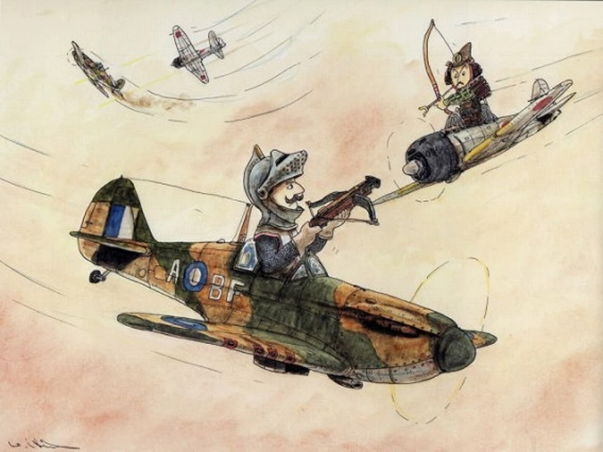 5枚目、元ネタはアメリカのプロパガンダアニメ。その中では日本機が作り物の雲を持って米空母に接近する。パイロットは当然メガネに出っ歯。