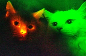 この画像を大きなサイズで見る2007年、韓国で光るクローン猫を作り出すことに成功したというニュースは既にお伝えしていると思うが、あっちは赤色蛍光タンパク質を持ち、暗い場所で紫外線を当てると赤く光る猫。今回の光る猫は、緑色蛍光たんぱく質(GFP)の遺伝子を挿入した猫なので、緑色に光るのでちょっと違う。