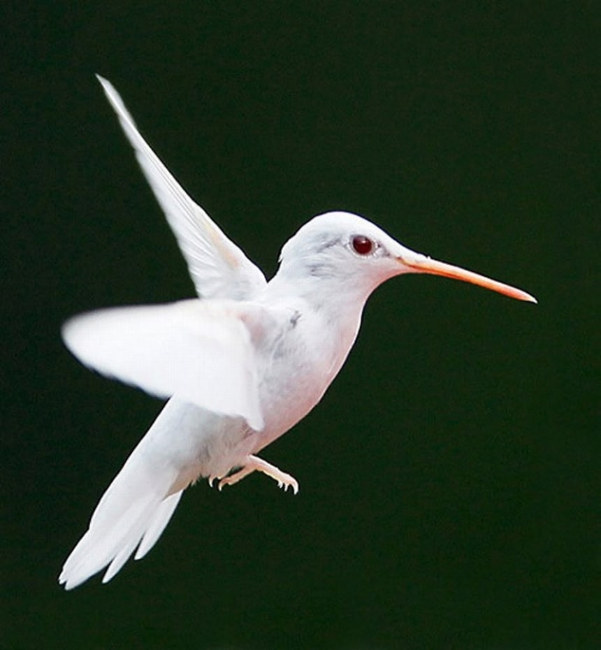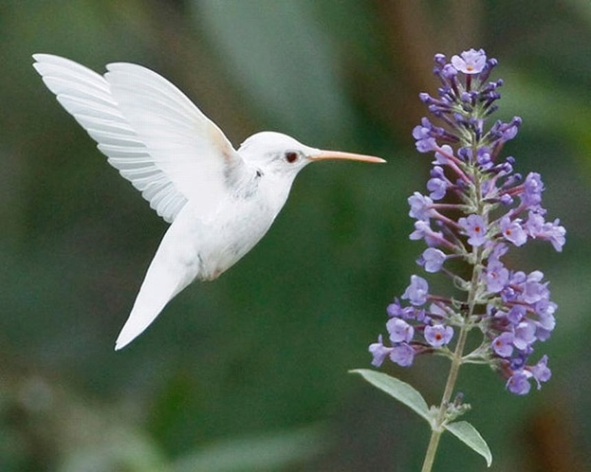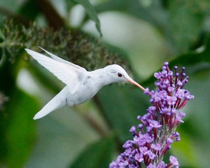 米、バージニア州スタントンでアルビノのハチドリの個体が確認されたそうだ。真っ白ながらもハチドリはハチドリ。「ブンブン」 とハチと同様の羽音を立て、ホバリングで空中で静止しながら、花の中にクチバシをさしこみ、おいしそうに花の蜜を吸っていたところを撮影した画像が公開されていた。