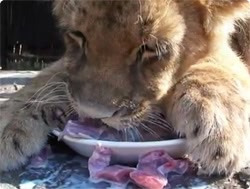 飼育員さんに用意してもらった食事のメニューはミルク漬けの生肉。まだ小さい子どもライオンの場合には、肉を舌で押しのけて、ミルクだけをチュウチュウとおいしそうに飲んでいくんだ。