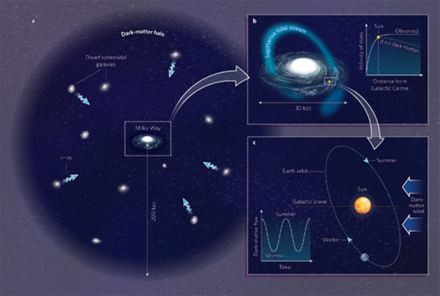 宇宙には通常の物質の約5倍の質量の暗黒物質が存在するとされている。宇宙には目に見える物質(星、星間ガスなど)だけしか存在しないとすると、銀河は自らの重力だけでは星を閉じ込めておくことができずバラバラになってしまうが、暗黒物質の存在を仮定することにより、実際に観測されるような銀河を再現することができるようになる。とは言え、暗黒物質の正体は依然として不明で、現代天文学および物理学における最も重要な未解決問題の一つとされている。