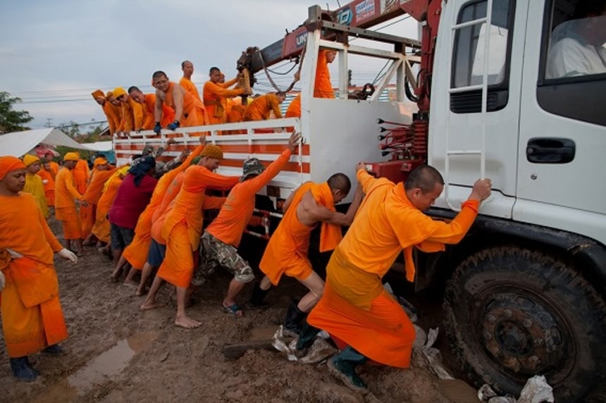 この画像を大きなサイズで見る動けなくなったトラックを押し出すタンマガーイの僧侶たち