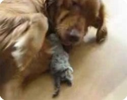 ここのお宅で飼われている仲良しな犬と猫は、一風変わったリレーションシップをとるのだそうだ。まず猫が頭を差し出す。それを犬が痛くないように口でくわえ、ずるずると移動させ、おいしく頭からムシャムシャするというもの。猫は犬に頭をひきずられているその感触が楽しいんだそうだ。人間のカップルにもいろんな愛情表現があるように、動物の間でもいろいろあるんだね。