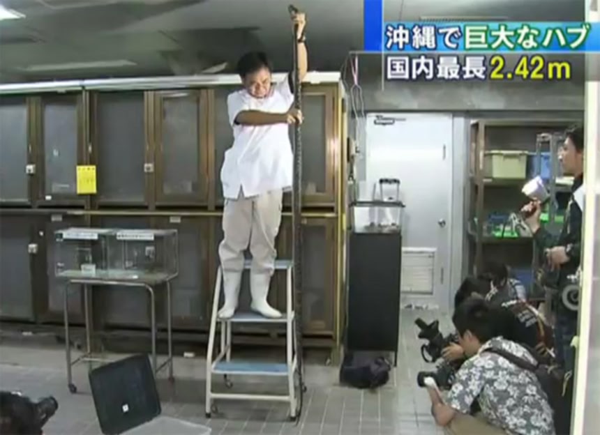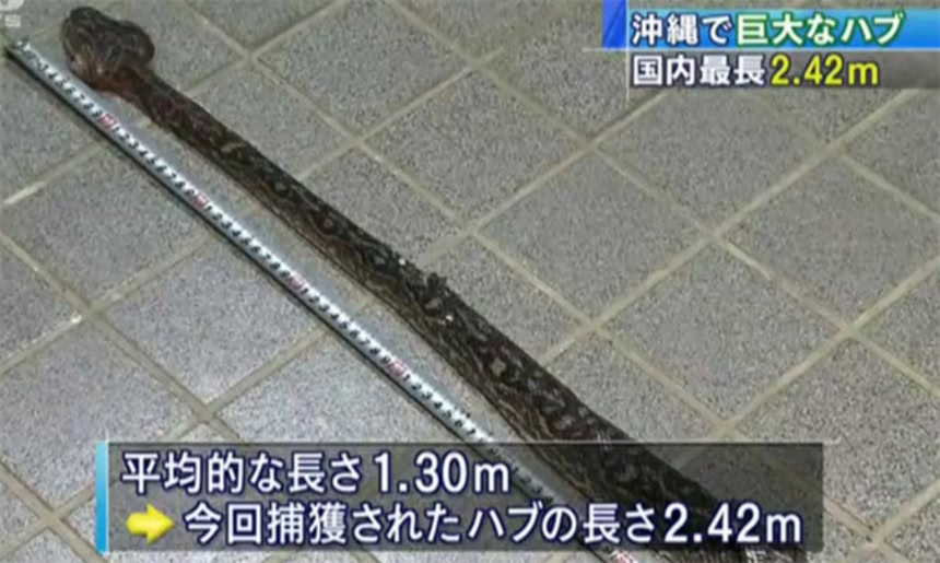 少し前のニュースなのだが、見逃してしまった人はチェックしてほしい。沖縄県恩納村(おんなそん)で国内最長のハブが捕獲された。床から天井まで届くほど大きなハブは、全長2m42cm。沖縄県衛生環境研究所は、1992年に奄美大島で発見された、2m41cmを超える国内最長のハブであると発表した。