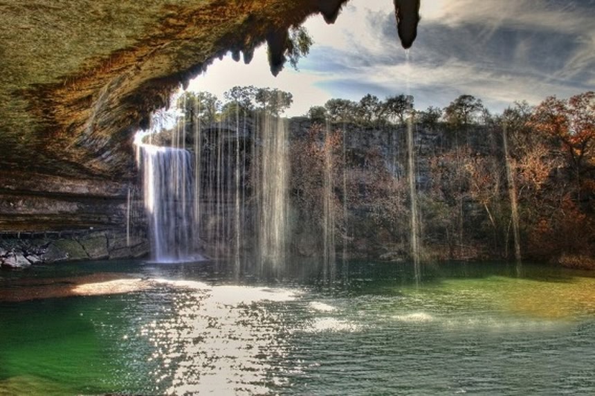 米テキサス州のオースティンには、数千年前、地下水脈の通る洞窟が侵食で崩壊してできた半地下湖、ハミルトンプールがある。ドーム状の洞窟の中の池をめがけ、高さ14mから流れ落ちる滝はまさに神秘。神々しいその美しさは必見である。
