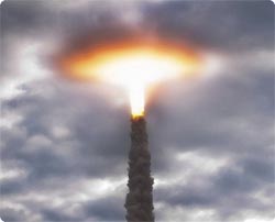 スペースシャトル「エンデバー」が最後の飛行で見せた、雲を貫き空に美しい大輪の花を咲かせた写真