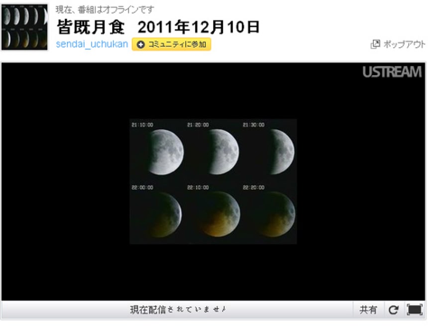 USTREAM: 皆既月食 2011年12月10日: 12月10日の皆既月食を中継予定