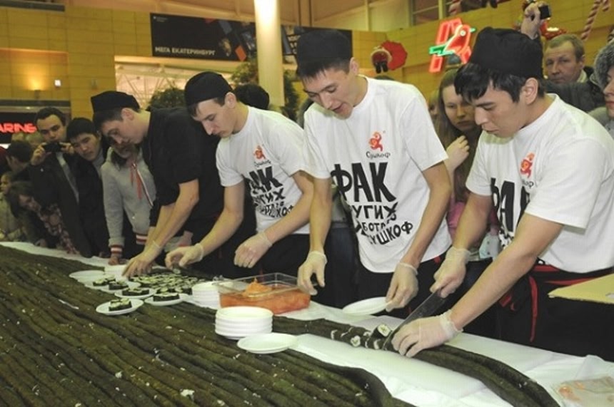 環境にあわせ多様化するのは地球上の生命体の生き残り戦術なのでまあしかたのないことなんだけど、ロシア、エカテリンブルクの寿司レストランでは、味よりも長さで勝負しようと、全長2.5キロメートルもあるかっぱ巻きを作り上げたそうだ。