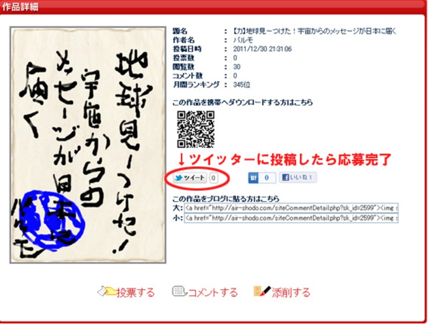 お年玉プレゼントの連絡もしやすいので、ツイッターを利用するよ。自分の作品が検索できたらそこにあるツイッターボタンを押したら応募完了だ。