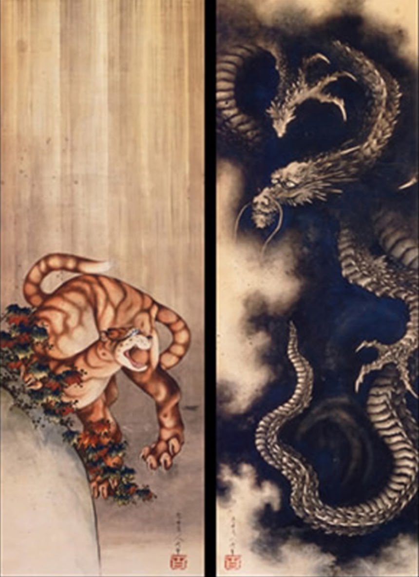 この画像を大きなサイズで見るちなみに「龍図」はフランスのパリにあるフランス国立ギメ東洋美術館が所有しており、太田記念美術館が所蔵している「雨中の虎」と対幅(ペア)になっている作品であるとして話題を呼んだ。