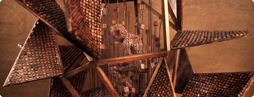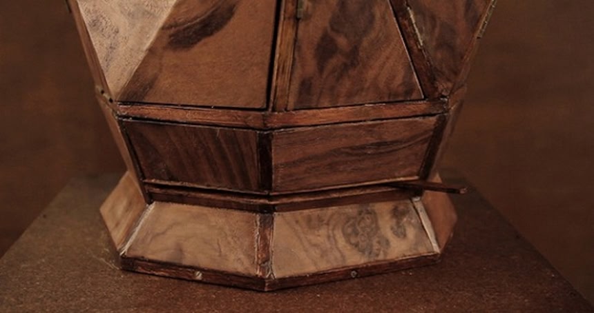 不規則な多角形の木製の箱の中で、思慮するポーズをとりながらクルクルと回る機械人形。これは人形や自分の頭に様々な素材を貼り付けたり切り刻んだりするアートワーク作品を手がけているアーティスト「Levi van Veluw」の作品。