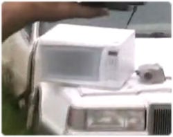 車に装備されているエアバッグを取り出し、それを電子レンジに入れて爆破させるとどうなるかを試してみる映像なんだ。最初はエアバッグを車のダッシュボードの上に置いて爆破させる実験からはじまるよ。