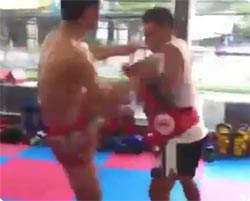 編集?とか思っちゃったぐらいに規則正しく何度も何度でもエンドレス状態でキックを繰り出すこの男性。受けるほうも大変な作業だよね。