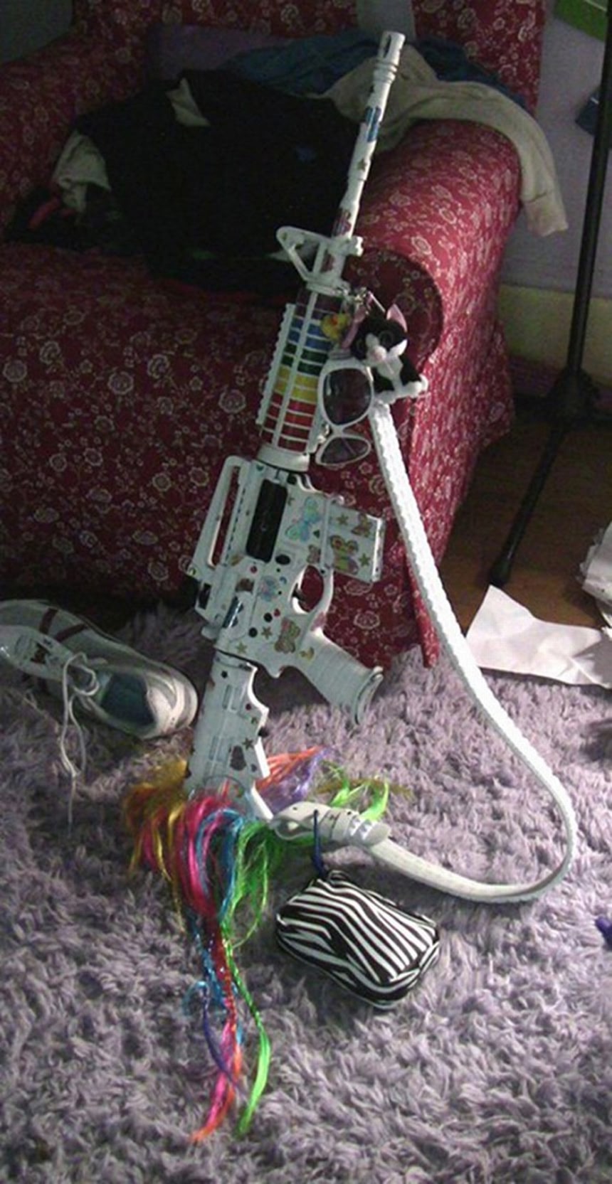 AR-15という小口径自動小銃が好きで、チェーンソーも好き。でもって女の子が大好きなユニコーンモチーフとか虹とかのパステルチックなイラストも大好き。ときたもんだからこれらを三位一体化させてカスタマイズしたというユニコーンAR-15とチェーンソーのアタッチメント。こんなにかわいらしくても銃は銃。映像ではかなり高精度で的をヒットさせていたよ。