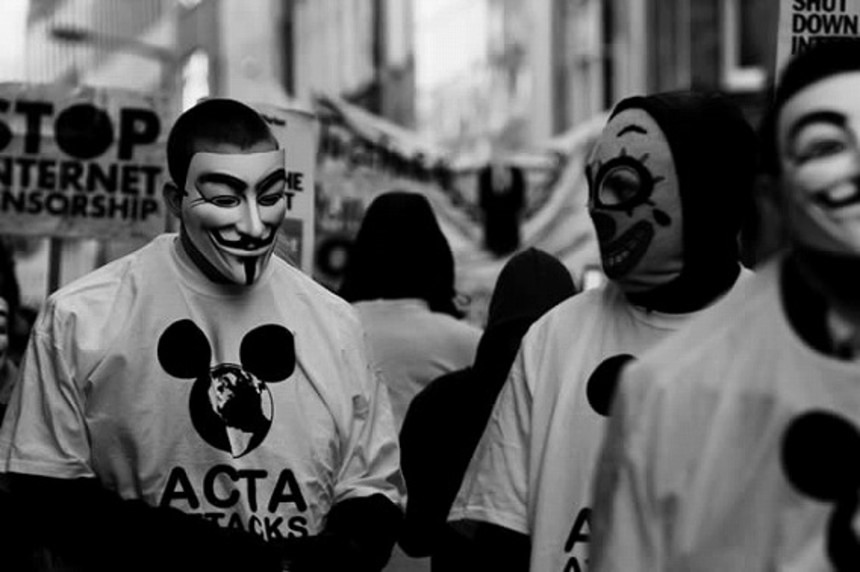 この画像を大きなサイズで見る欧州各地で11日、欧州連合(EU)27か国と他10か国で交渉を進めている「偽造品の取引の防止に関する協定(ACTA)」はインターネットの自由を損なうと抗議する大規模デモが行われた。