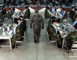 食堂に座っている軍人は、水色の布を首にかけて配られた食事を緊張感を保った状態で口に運ぶ。彼らが食事できる方法はこの直角方式のみで、中間に飲食物が落ちてしまえばそれを食べることができないそうだ。
