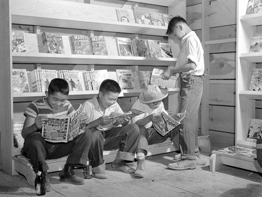 この画像を大きなサイズで見るカリフォルニア州サクラメントの州のツールレイク収容所で雑誌やマンガを読む日系人少年たち