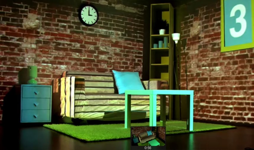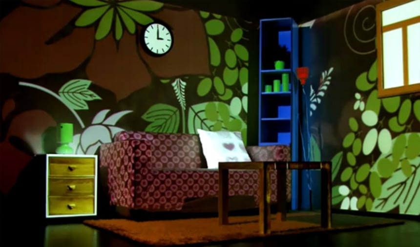 家具も壁もカーペットもすべてが真っ白の部屋。この部屋にマッピングプロジェクトで映像を投影し、カラフルで様々なタイプの部屋に一瞬にして模様替えしてしまうという面白映像。これなら毎日気分で部屋の雰囲気を変えられて便利だよね。
