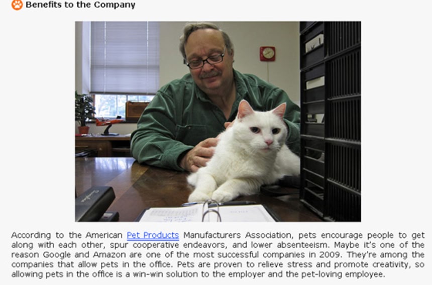 この画像を大きなサイズで見るアメリカでは既に、社内にペットを持ち込んでもよいという会社もあるようだが、当然アレルギーのある人や動物嫌いな人も存在するわけで、きちんとしたガイドラインとルールの導入が必要になっているようだね。