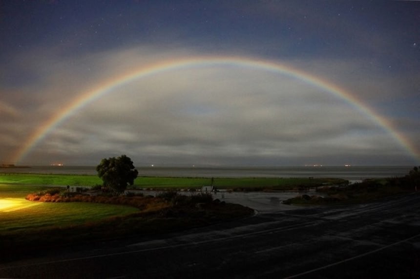 夜間に、月の光により生じる虹。光が弱いために色彩が淡く、虹が七色ではなく白く見えることから、白虹(はっこう)とも呼ばれる。