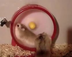 ハムスター専用回し車の上にはタイムを計る時計が装備されているのだが、この事実を知ってか知らずか、2匹のハムスターたちが競い合うようにしながら記録更新に精を出している映像。