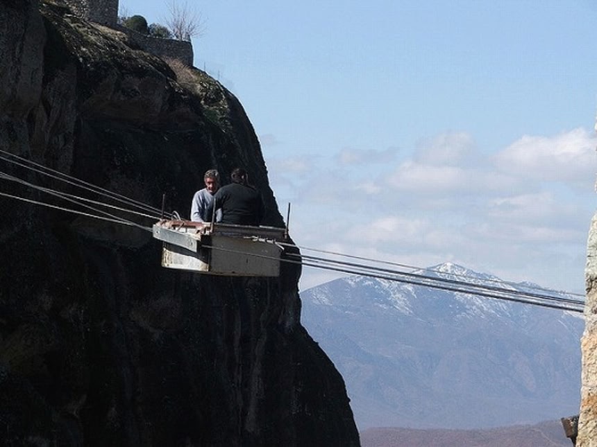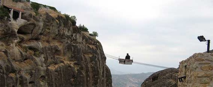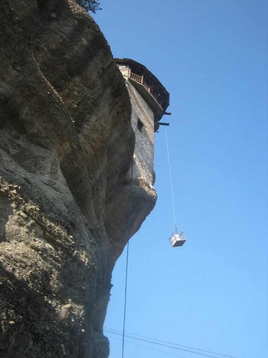 14世紀頃、メテオラには地上400mの奇岩の頂に数々の修道院が建てられた。その中でもひときわ大きいメタルモルフィス修道院には紐の上に箱を乗せたレベルのロープウェイがあるそうで、修道士たちは現在でもこのロープウェイで物資を運んでいるそうだ。