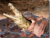 獰猛なワニですらカバの団体さんにはかなわない。悲痛な表情でカバに食われていくワニの写真