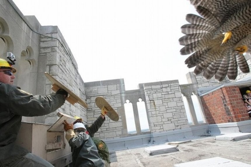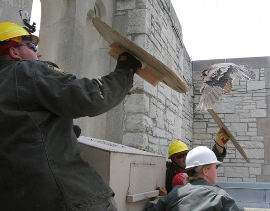 この画像を大きなサイズで見るヘルメットに盾を持ち、迫り来るハヤブサのお母さんの猛攻撃から必死で身を守る人間たち。いったい何が起きているのかというと、米オハイオ州にあるトレド大学の時計台には人工的に設置したハヤブサの巣箱があり、ハヤブサのお母さんは毎年そこに卵を産みに来る。動物研究者たちは、調査研究のため、そこで生まれたヒナに採血と識別チップの取り付けに挑んでいるのだが、「子どもが奪われる!」と人間たちを敵認定したハヤブサ母は、本気モードで研究者たちに襲い掛かるのだ。