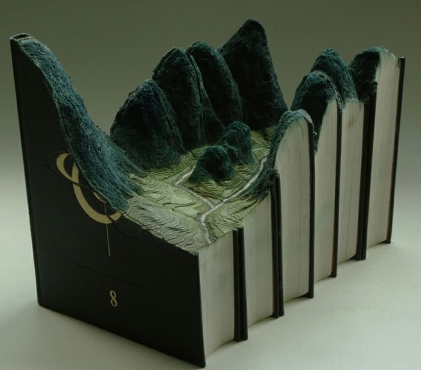 分厚い百科事典や辞書などを彫刻刀でこつこつと削り上げ、その質感を生かしつつ、渓谷や山、波や聖堂などを作り上げるという本の立体彫刻。これらの作品はアーティストでもあり作家、作曲家、歌手、ディレクターと、多彩なる才能を各方面で発揮しているGUY LARAMEE氏の手がけたもの。