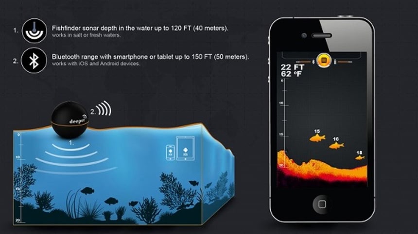 防水加工された球形の機器『Deeper FishFinder』は、小さなソナー装置だ。スマートフォン対応で、釣りの成果をより実りあるものにできるという。