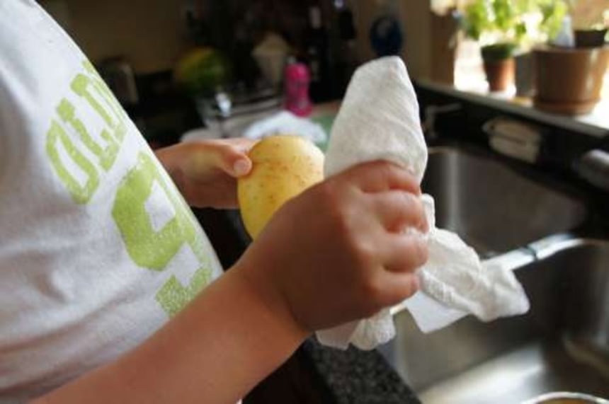 1.じゃがいもを洗いペーパータオルでしっかりふき取り乾燥させる。この画像を大きなサイズで見る