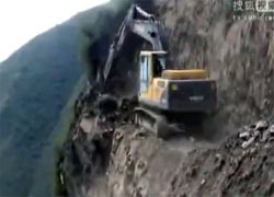 中国四川省にて、切り立った断崖絶壁で高所作業をする1台のショベルカーが。その幅はまさに1台がやっと乗っかれるレベル。というかどうやってこの場所にショベルローダーを運んだのか?そこも謎なんだ。